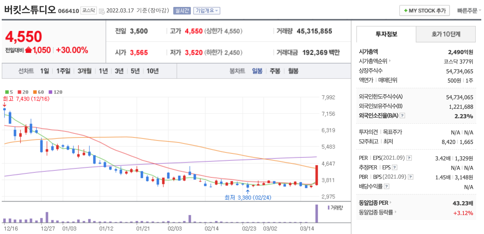 버킷스튜디오가 17일 가상화폐·블록체인 사업에 진출한다는 소식에 장중 상한가를 기록했다..