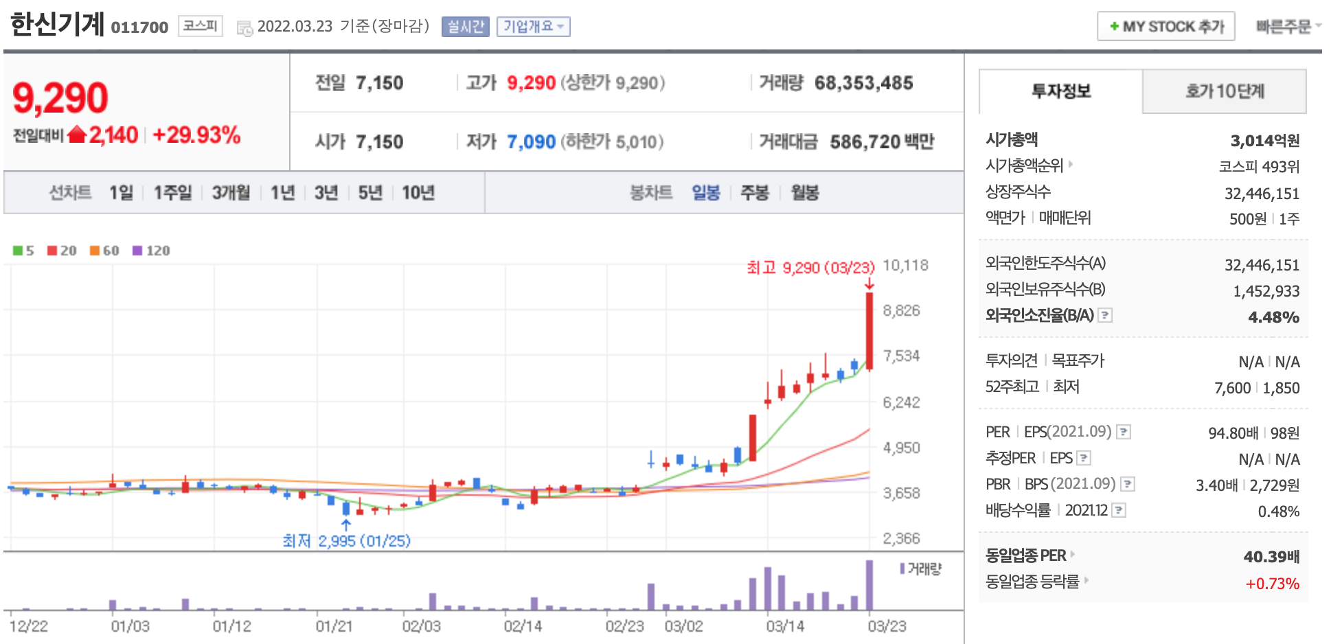 한신기계 주가가 상승 중이다. 한신기계 주가는 윤석열 대통령 당선인의 공약으로 인해 상승 중인 것으로 풀이된다.