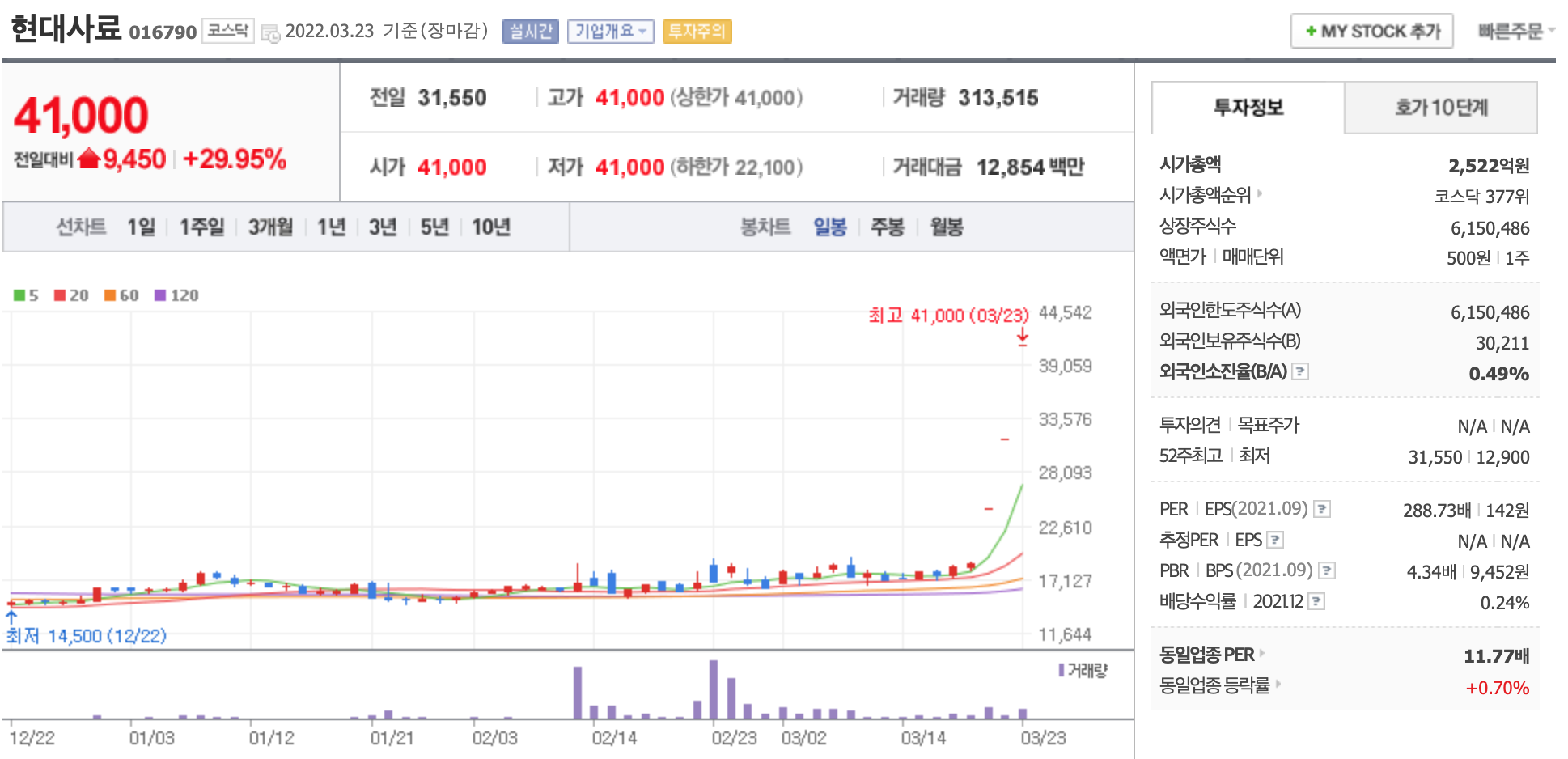 현대사료가 사흘 연속 상한가에 안착하며 최고가를 기록하고 있다.