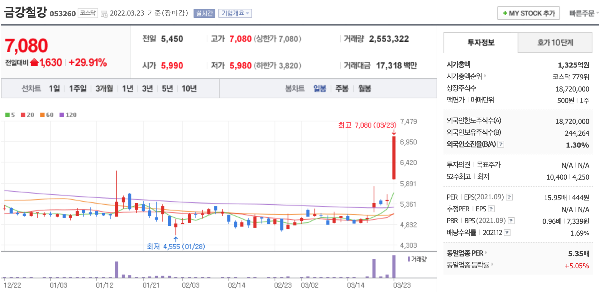 상한가 종목과 관련기사입니다. 🐜🐜출처 - 네이버 증권