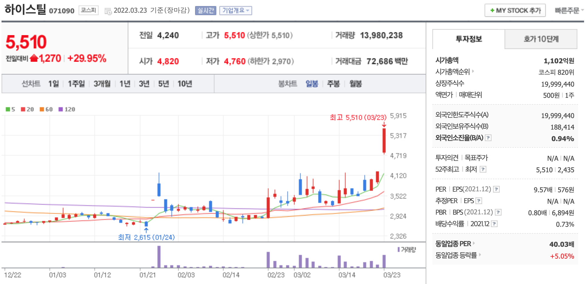 이날 철강주가 상승세를 이어가는 까닭은 유럽 최대 철강 공장 중 하나인 아조브스탈이 러시아군의 공격으로 심각한 피해를 봤다고 알려진 여파로 풀이된다. 철강 수급 차질 우려가 불거지면서 국내 철강업체의 수출이 확대될 수 있다는 기대감이 이는 추이다.