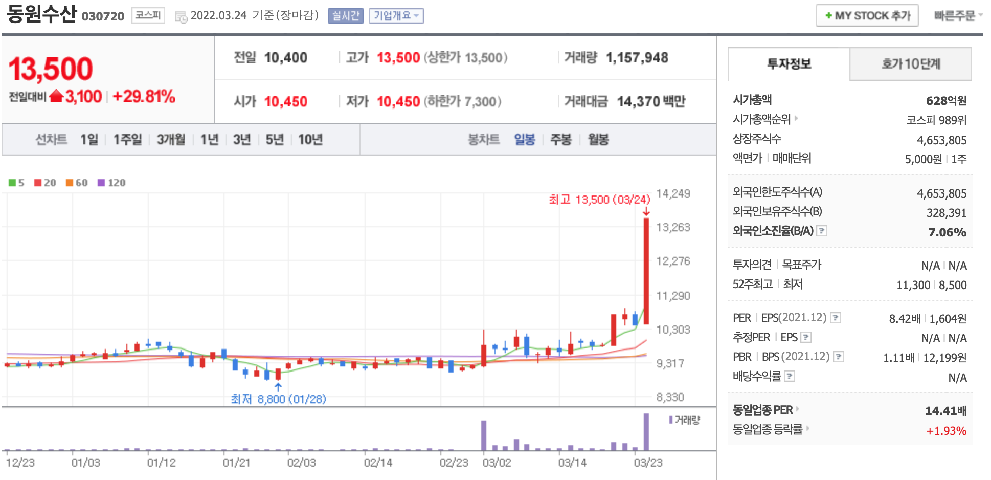 세계적인 곡물 수출국인 러시아와 우크라이나의 전쟁이 장기화되자 이들 업체의 수요 증가와 판매 가격 인상 등 실적 개선으로 이어질 것이란 기대감이 유입됐다. 전쟁 장기화에 따른 수산물 항공 운임비 증가 등 식량위기 우려에 매수세가 몰린 것으로 풀이된다.