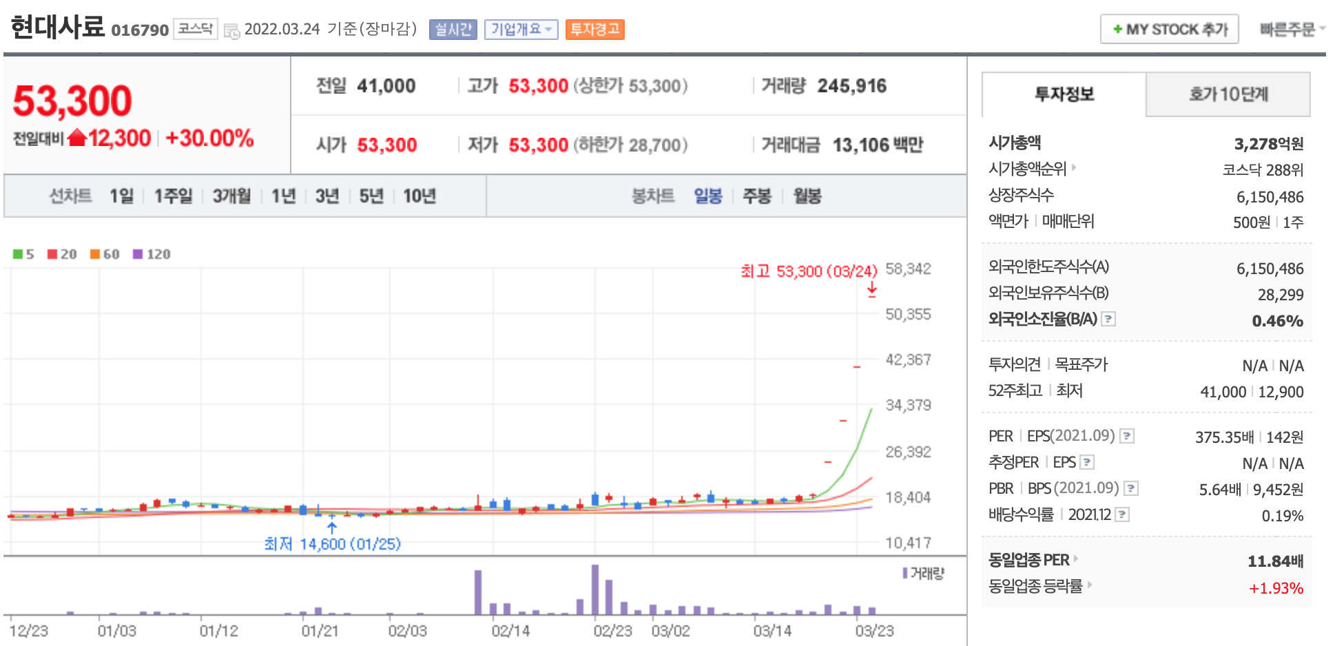 우크라이나 전쟁 이후 식량 공급난이 대두되면서 식량 관련주는 강세를 지속하고 있다. 전날(23일)에는 한일사료, 현대사료 등 사료주가 상한가를 기록했다. 다른 식량 관련 업체들도 급등하고 있다.