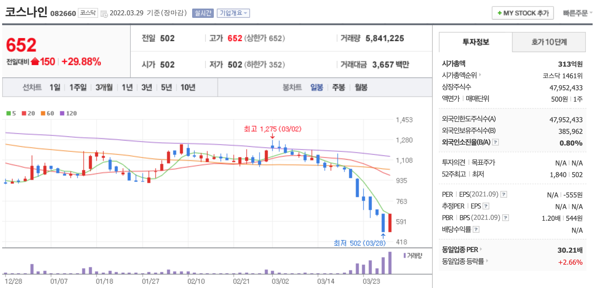 코스나인 주가 상한가↑…지난해 매출액 101억
