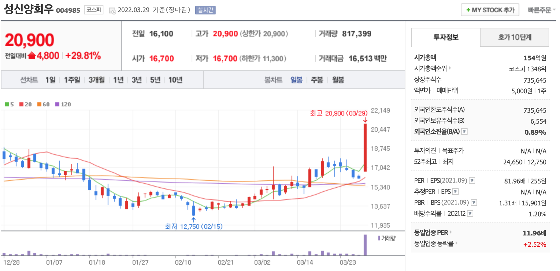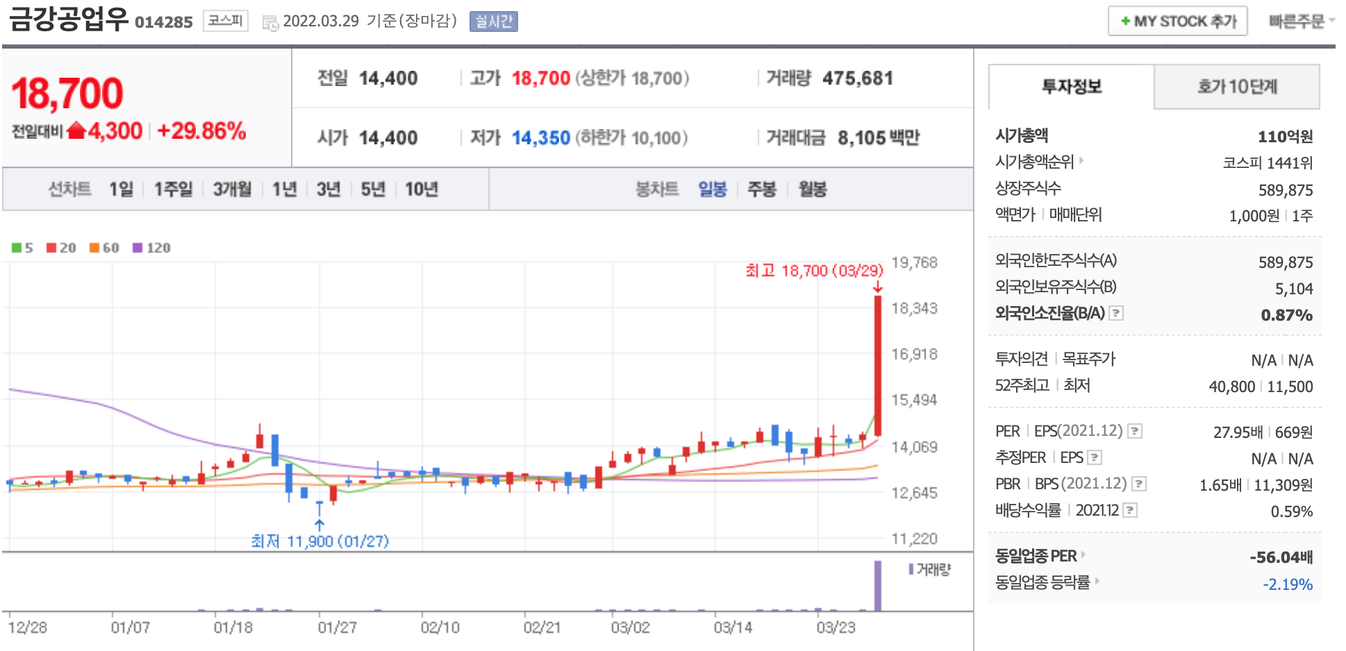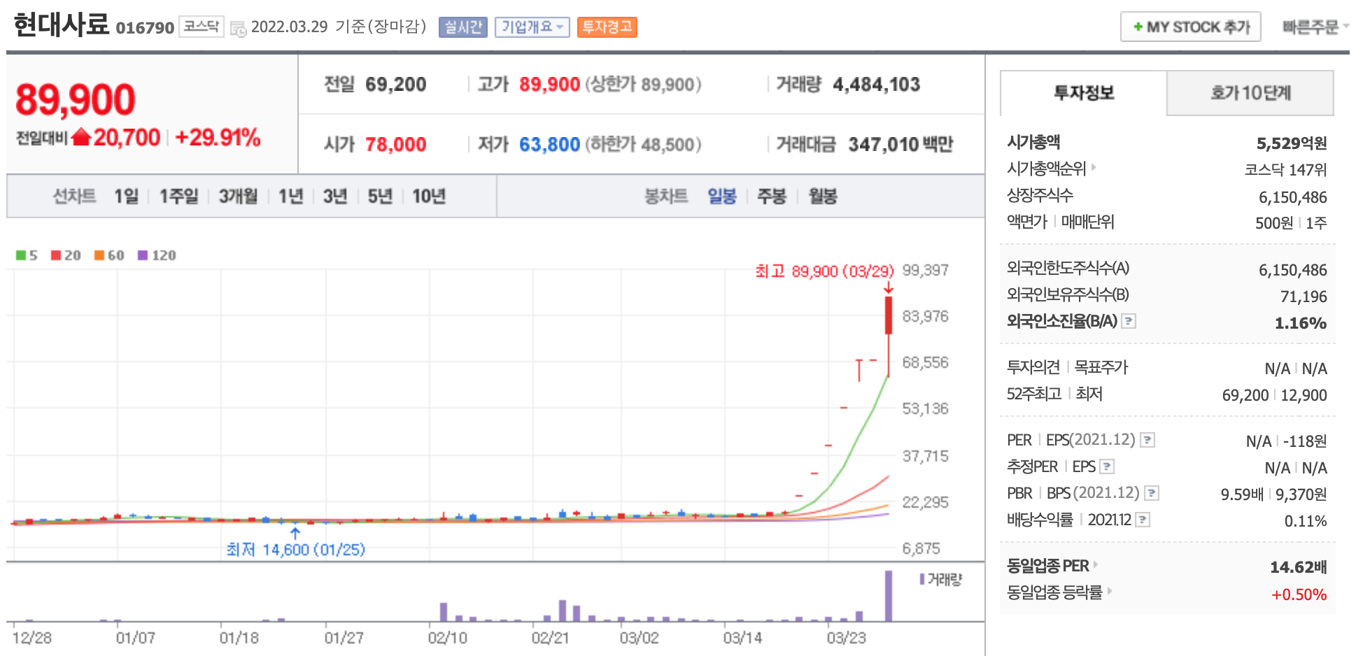 현대사료가 급등하고 있다. 최대주주 변경 기대감과 우크라이나 전쟁으로 인한 곡물 가격 급등하면서 5 거래일 연속 상한가를 보였다.