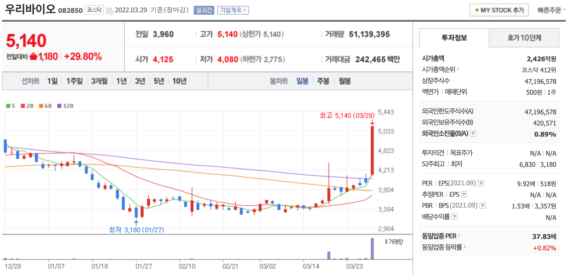 우리바이오가 29일 산업용 대마 합법화 추진 소식이 상한가에 도달했다.