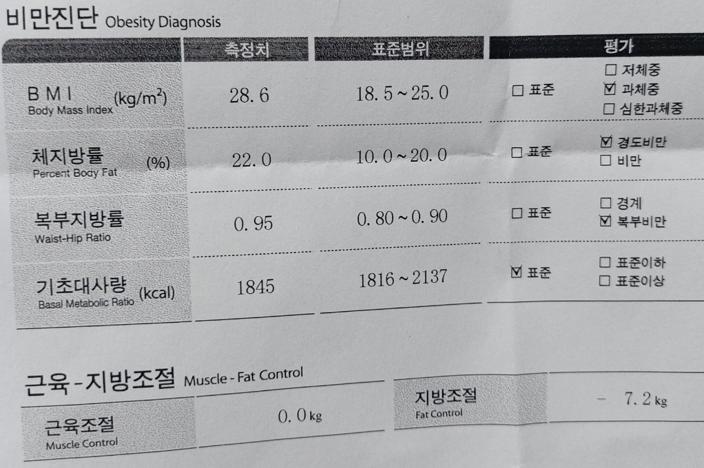 비만지수를 나타내는 BMI는 과체중으로 나타났고, 지방 조절을.. -7.2kg나 해야 합니다...