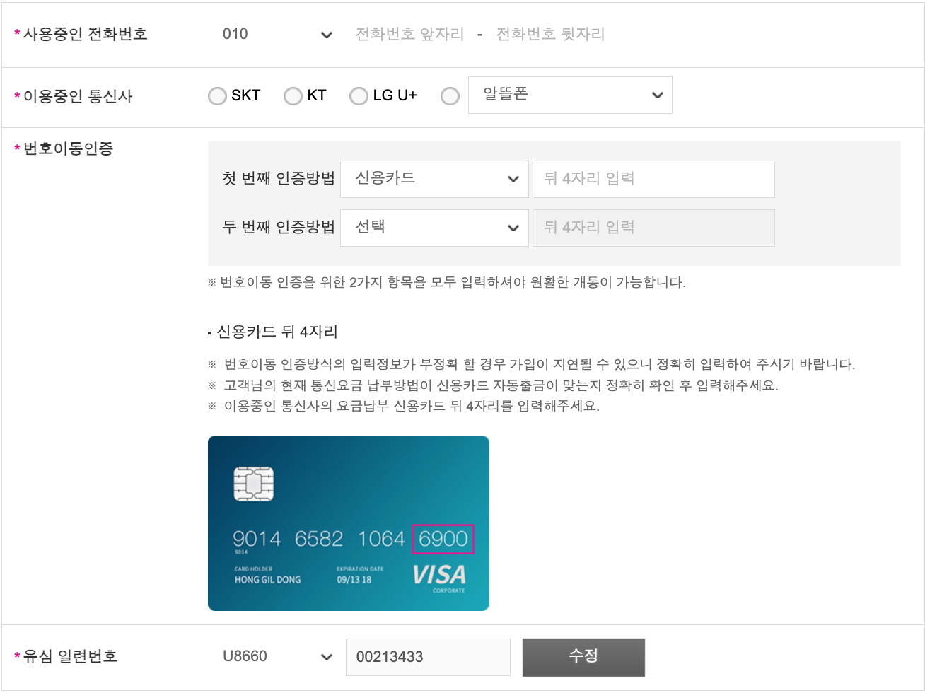 이 숫자들을 입력해주시면 됩니다. 저는 신규가입이 아닌 번호를 그대로 사용하는 번호이동을 선택을 했고,