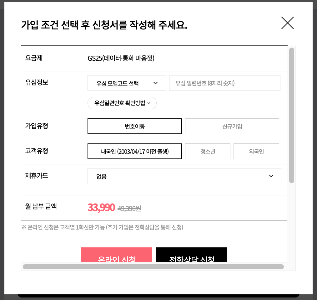 그러면 이러한 가입 신청서 창이 뜹니다. 먼저 유심 모델 코드 선택을 해야 하는데..