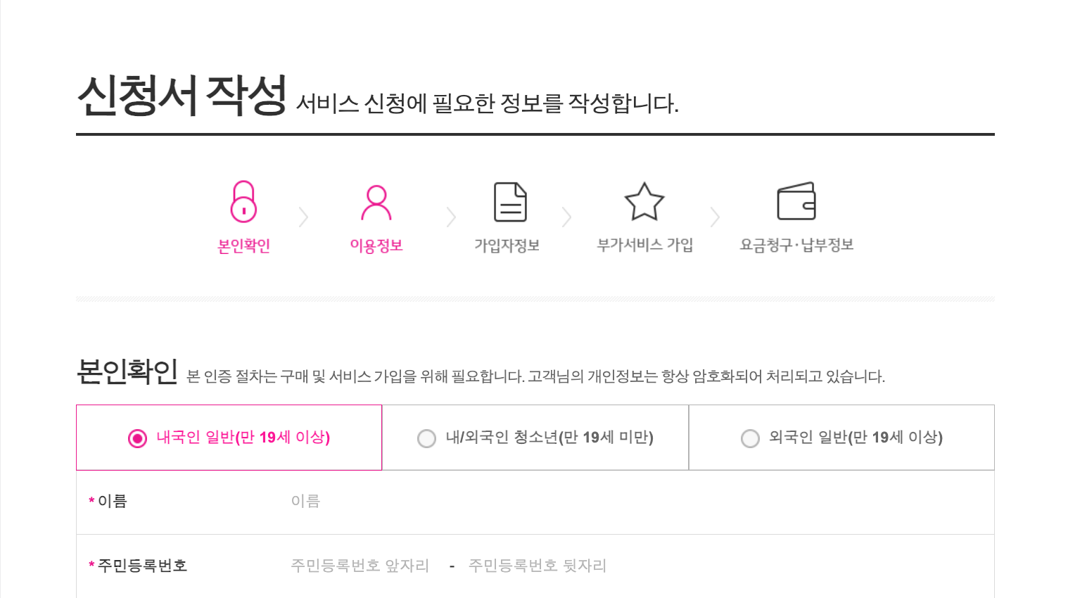 신청서는 본인 확인, 가입자 정보, 부가서비스 가입, 요금 청구, 납부정보로 이루어져 있습니다.