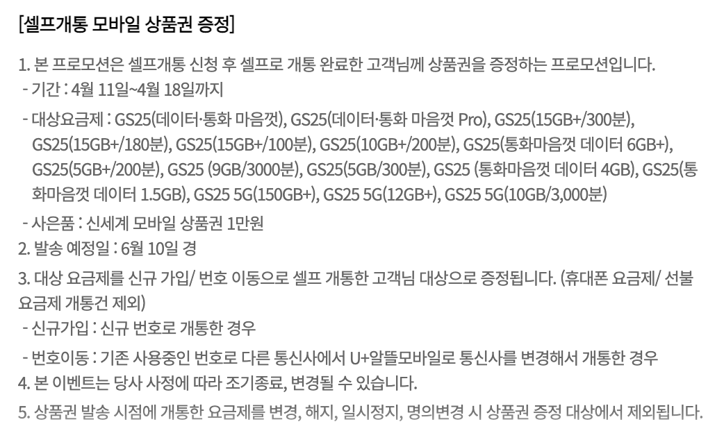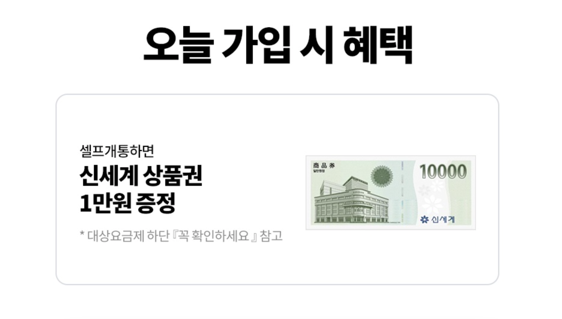 와.. 셀프 개통 즉 혼자서 개통을 하면 신세계 상품권 1만 원을 증정해준다고 합니다.🤭