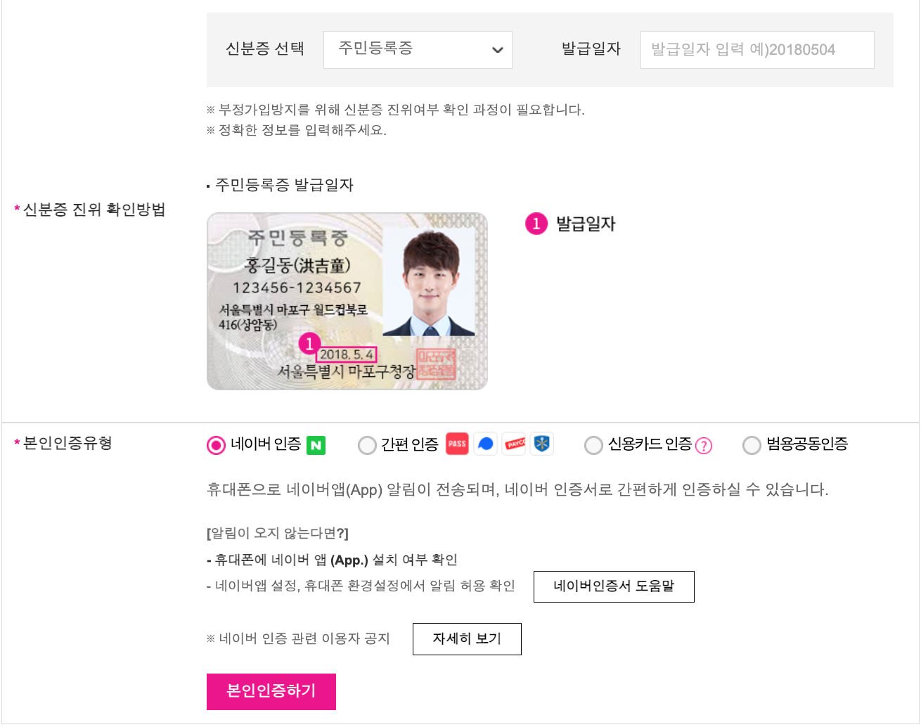 주민등록증 또는 운전면허증으로 본인 확인을 하며,