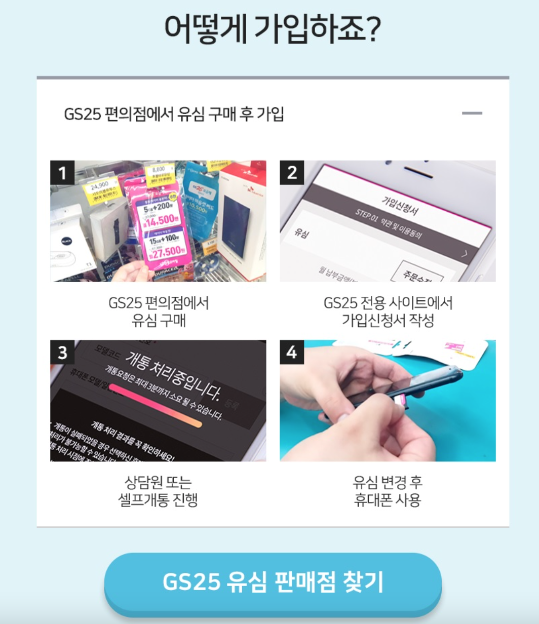 가입을 원하시는 분들은 꼭! 상단에 보이는 GS25 유심 판매점 찾기를 하고 가시는 것을 추천드립니다.