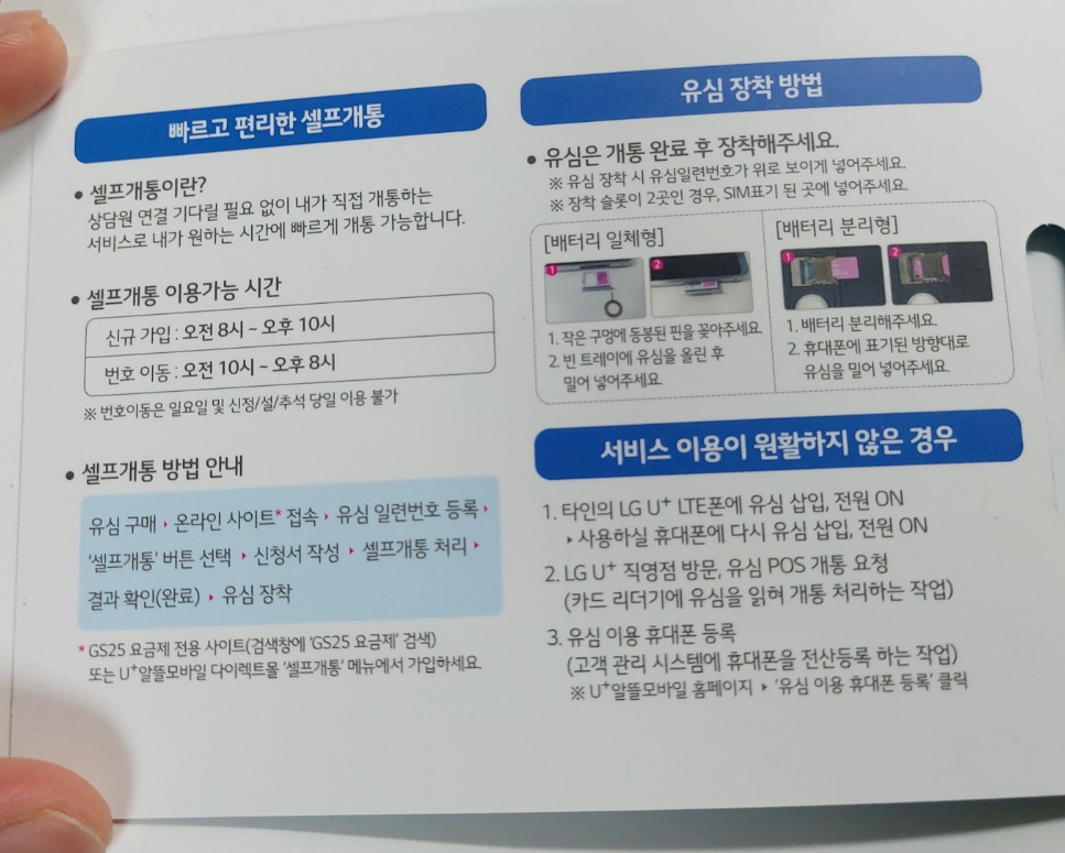 유심 케이스를 열어보면 셀프 개통의 설명과 가능시간, 방법 안내까지 친절하게 나와있습니다.