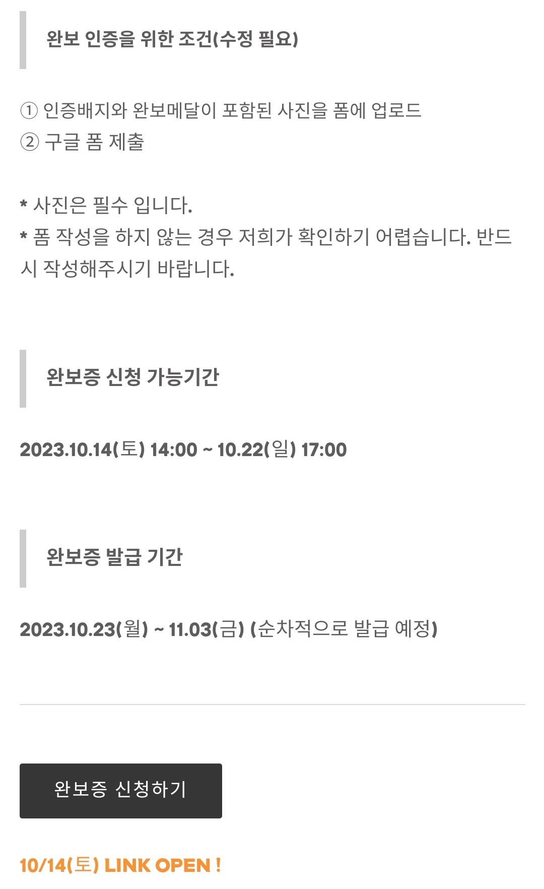 카카오톡 채널에서 완보증을 신청할 수 있으며, 신청을 대회일이 시작하는 날부터 가능합니다.