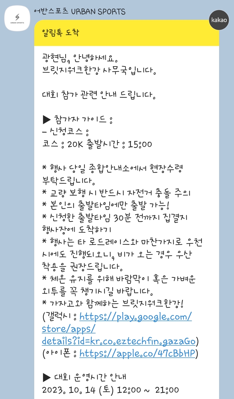 구매를 하게 되면 구매 관련 카톡이 오게 됩니다. 저는 햇빛이 조금 덜 한 15:00 출발로 선택했습니다.