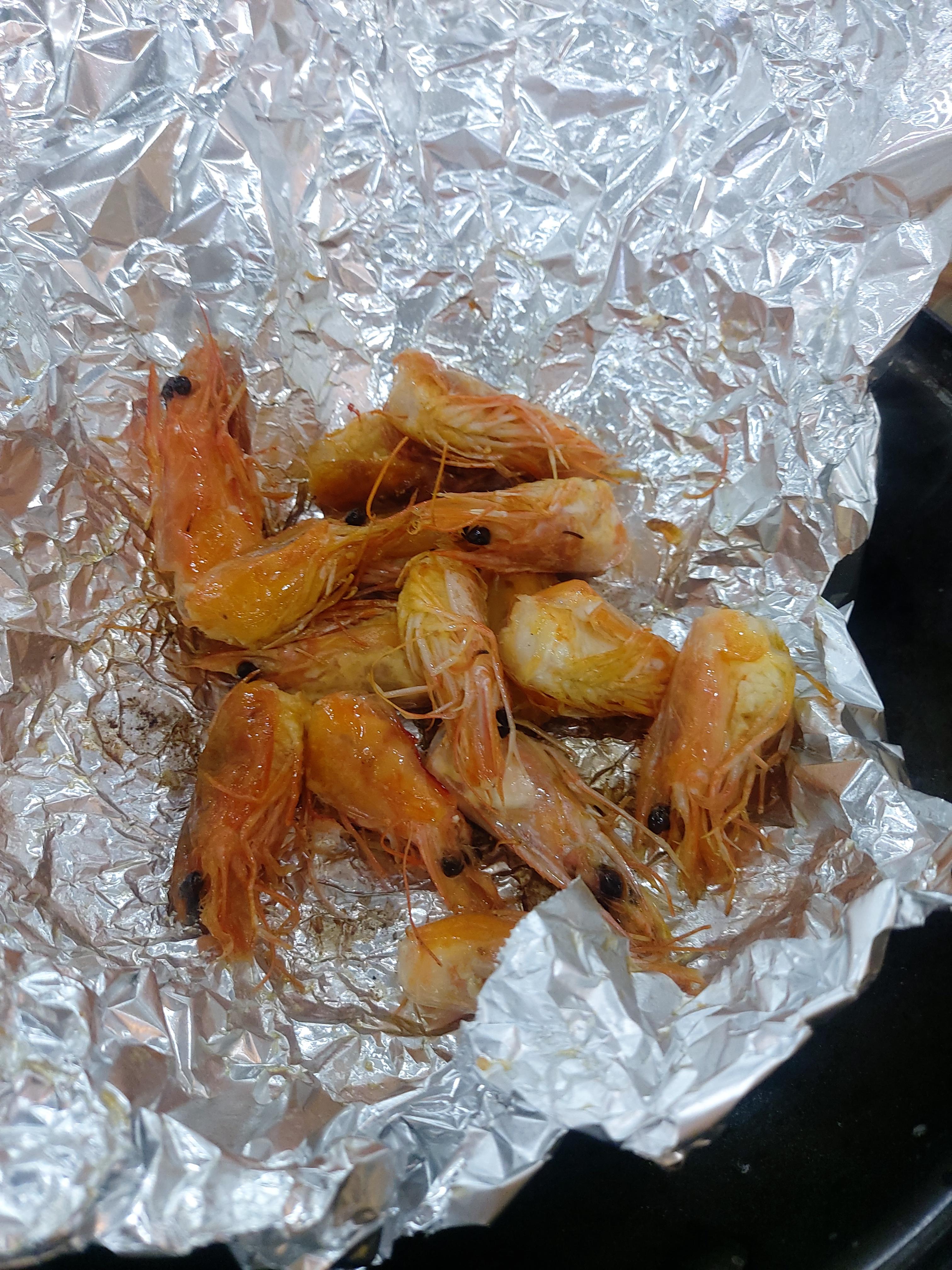 새로운 호일을 깔고 버터를 녹여준 다음 남아있는 대하 머리를 넣고 같이 구워주면...