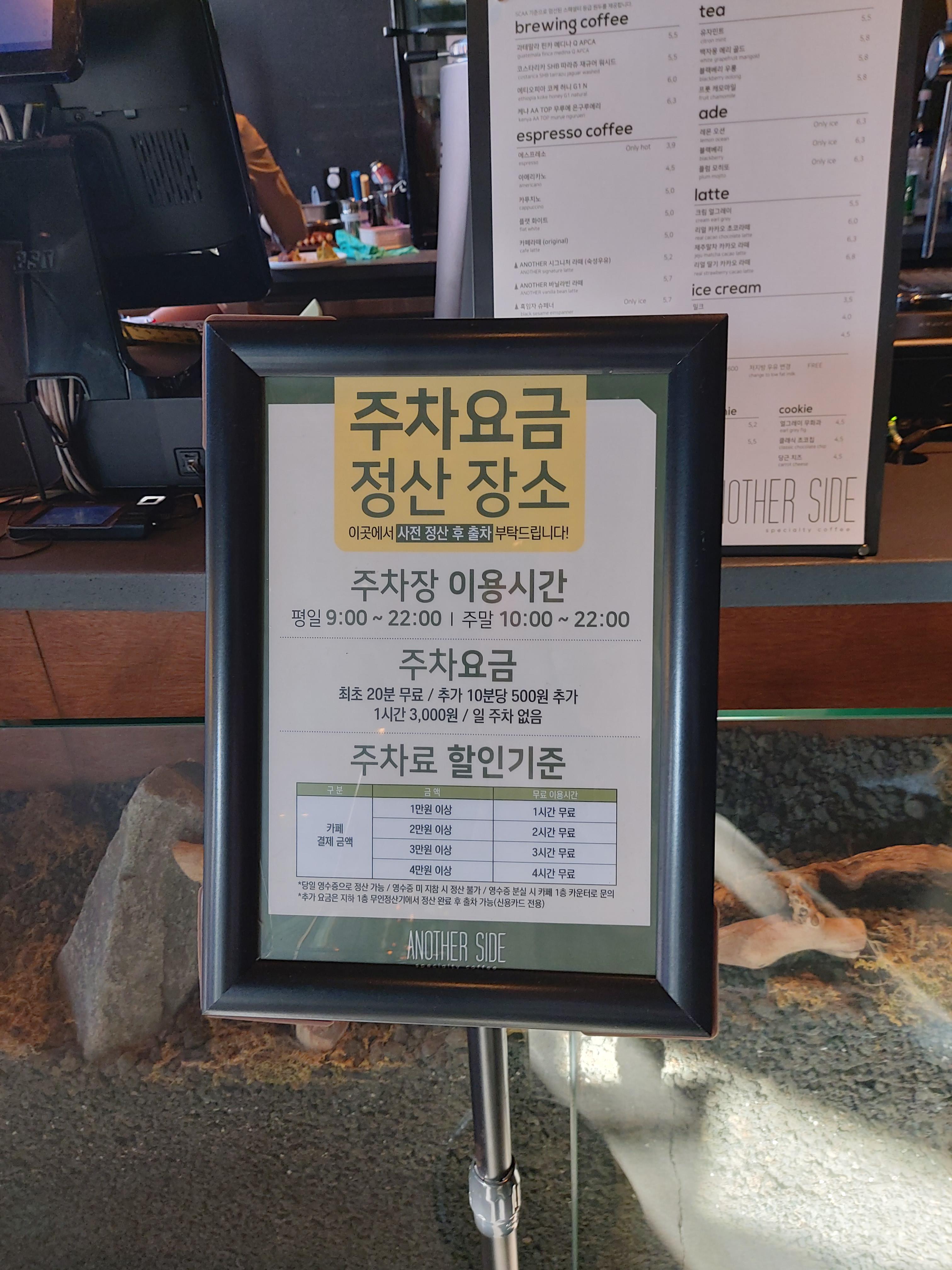 주차는 기본 20분 무료이고, 카페 주문 금액에 따라 시간이 늘어납니다.