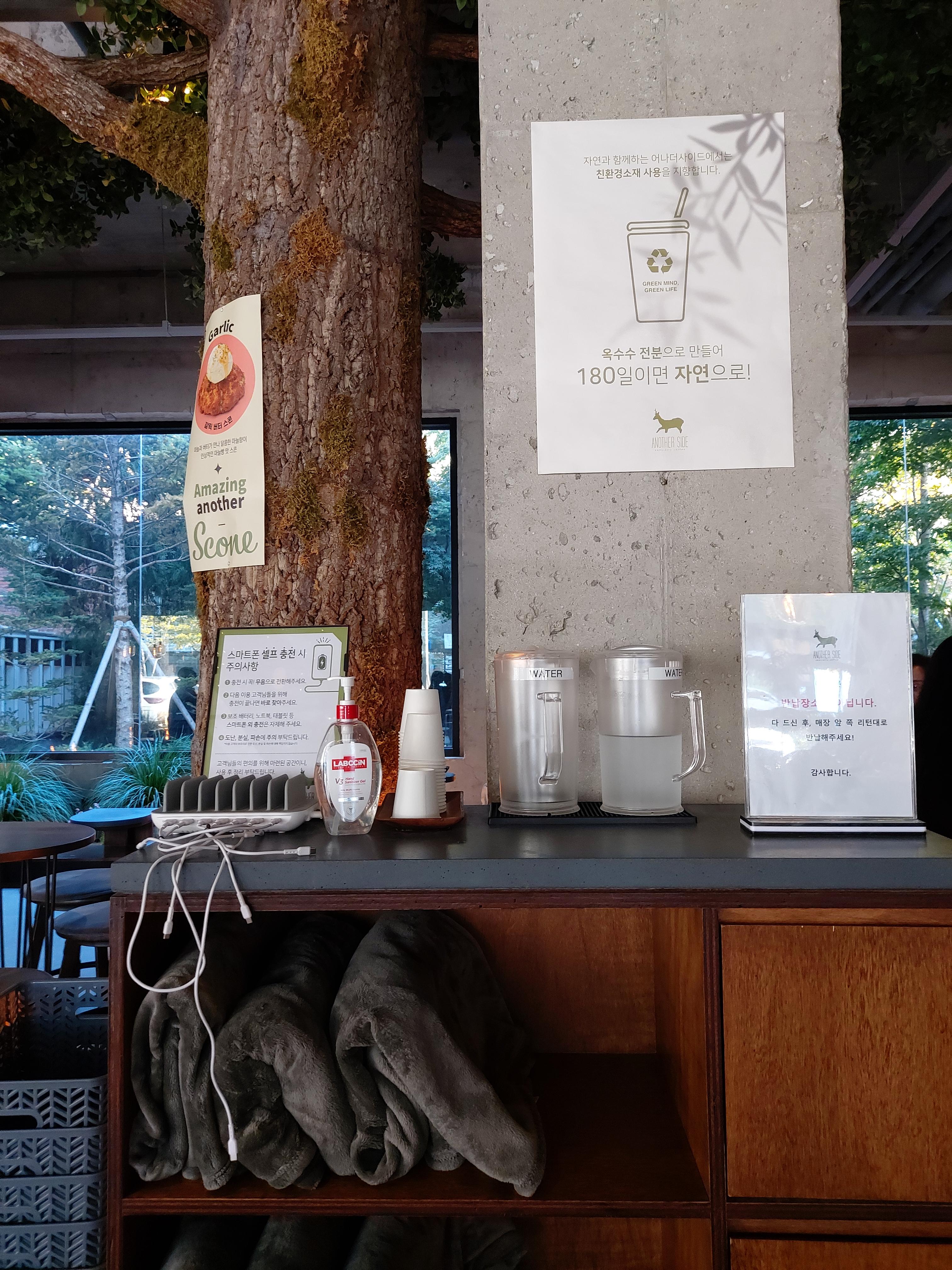 또한 카페 한 켠에 물과, 충전기, 담요들등 필요한 물품들이 있어서 좋았습니다.