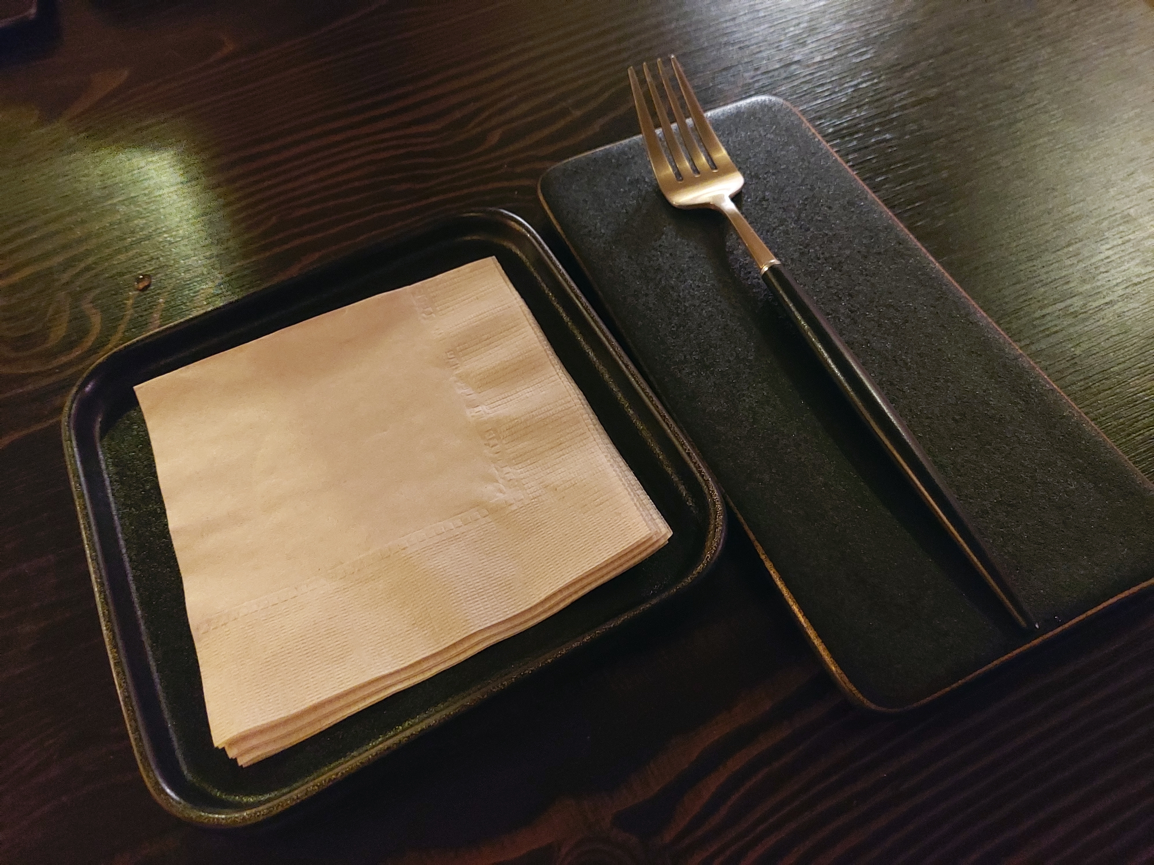 테이블에는 기본 앞접시와 포크가 있으며, 주문하시는 메뉴에 따라 나이프를 가져다주십니다.