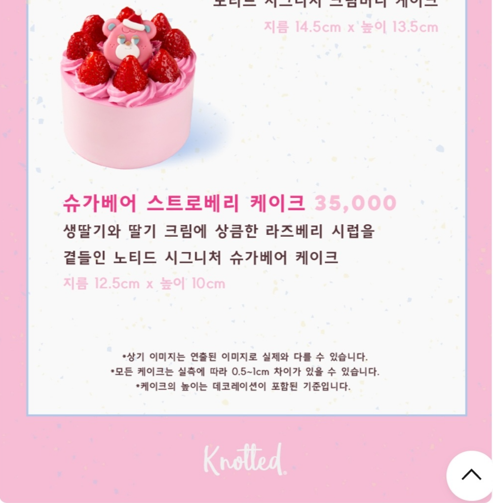 생딸기와 딸기 크림에 상큼한 라즈베리 시럽을 곁들인 노티드 시그니처 슈가베어 케이크입니다.