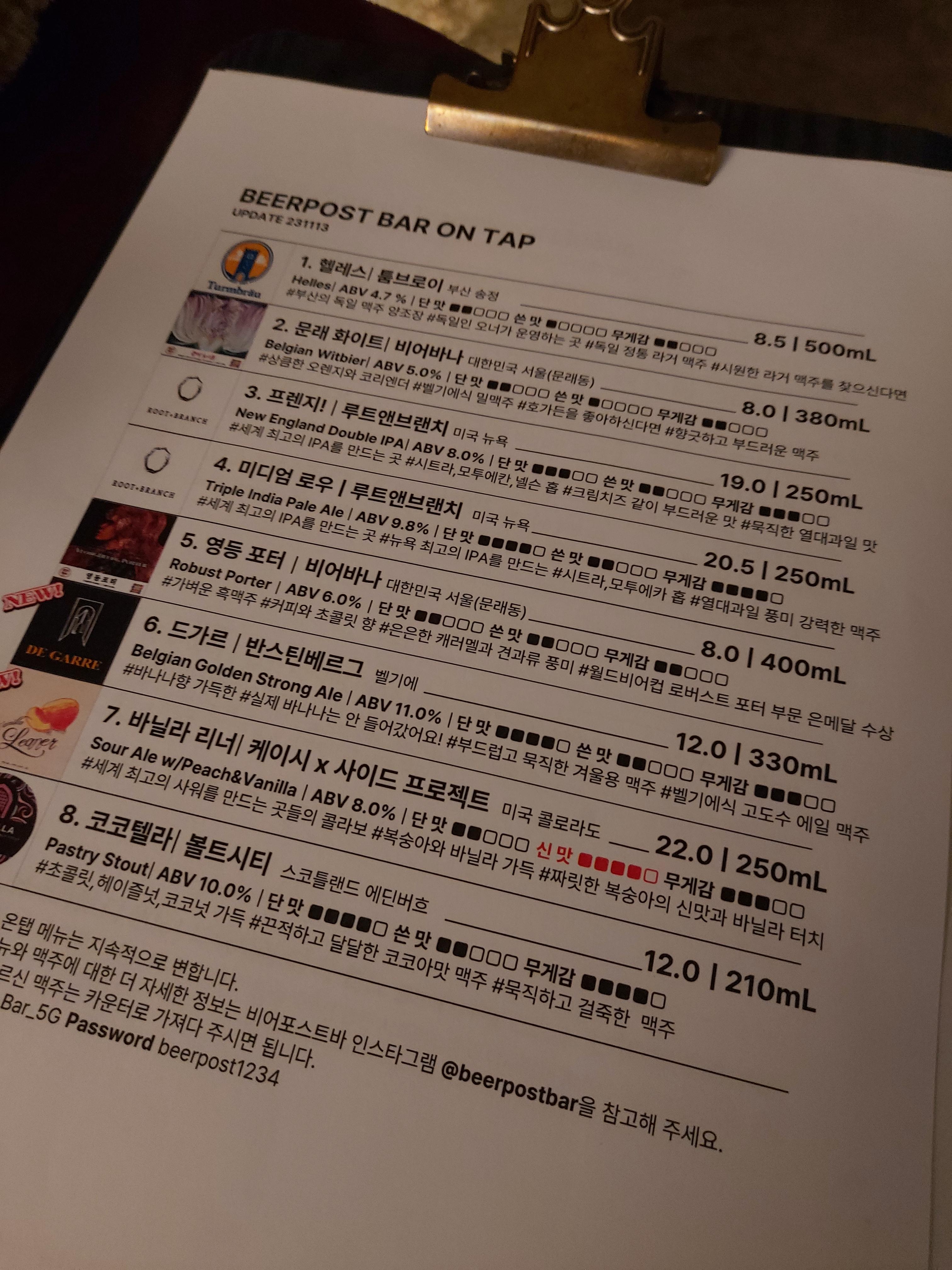 가장 먼저 비어포스트 바 답게 생맥주가 제일 앞장에 있습니다.