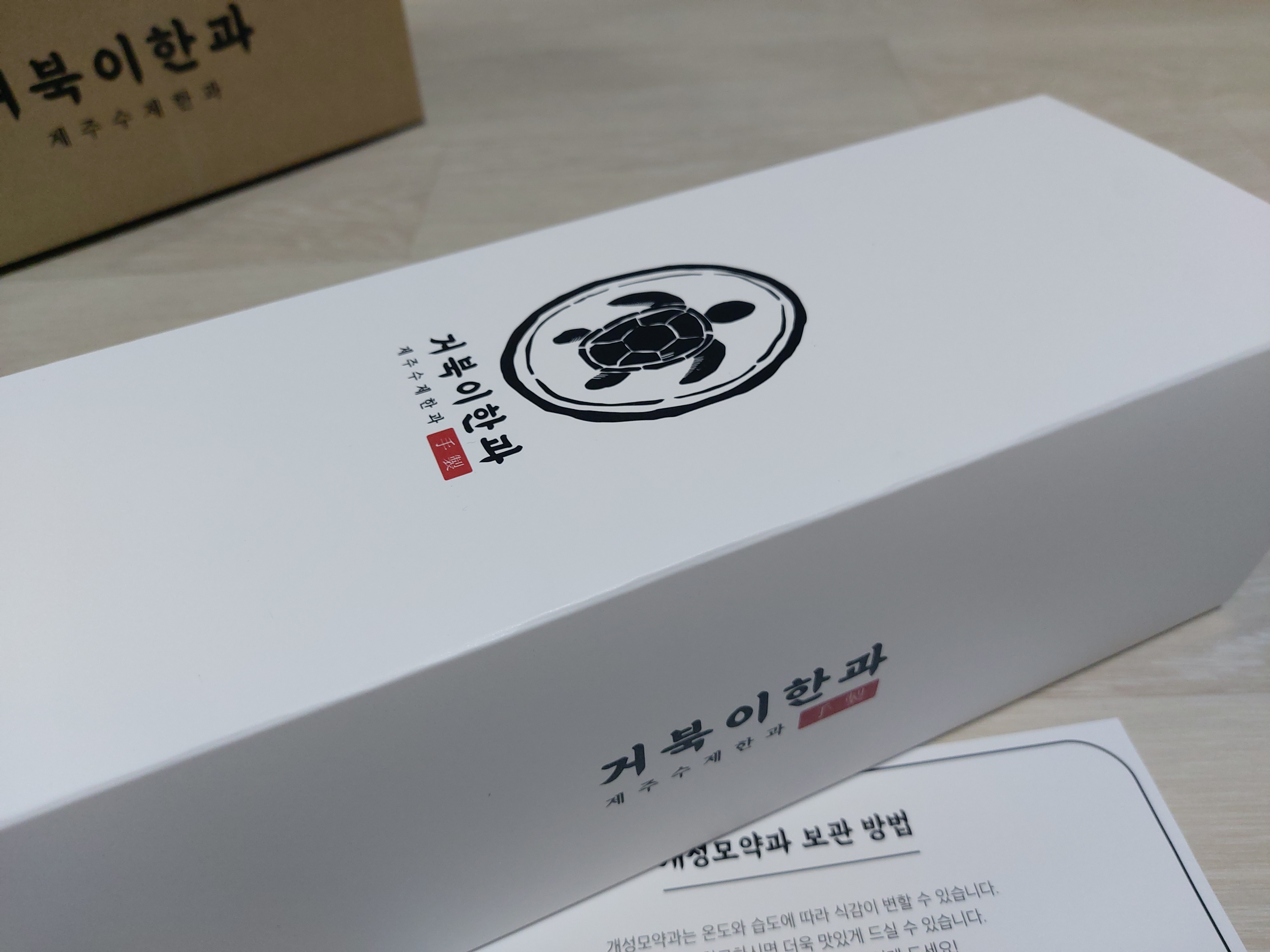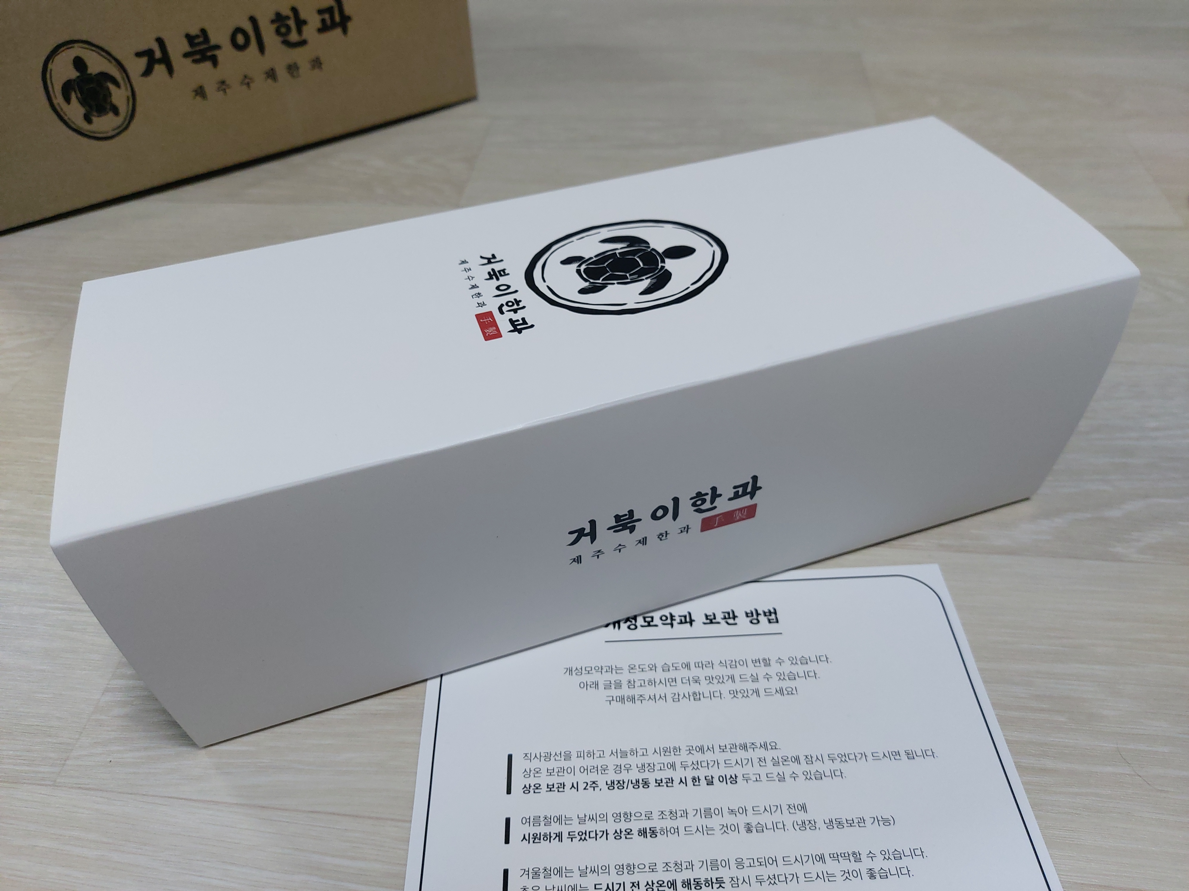 튼튼한 박스로 배송이 되며, 안에는 이쁜 케이스로 포장되어 온 제주 거북이 한과의 모습니다.