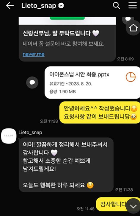 원본과 보정본 개수도 계약서보다 훨씬 많이 보내주시고, 땡큐카트에 릴스까지….