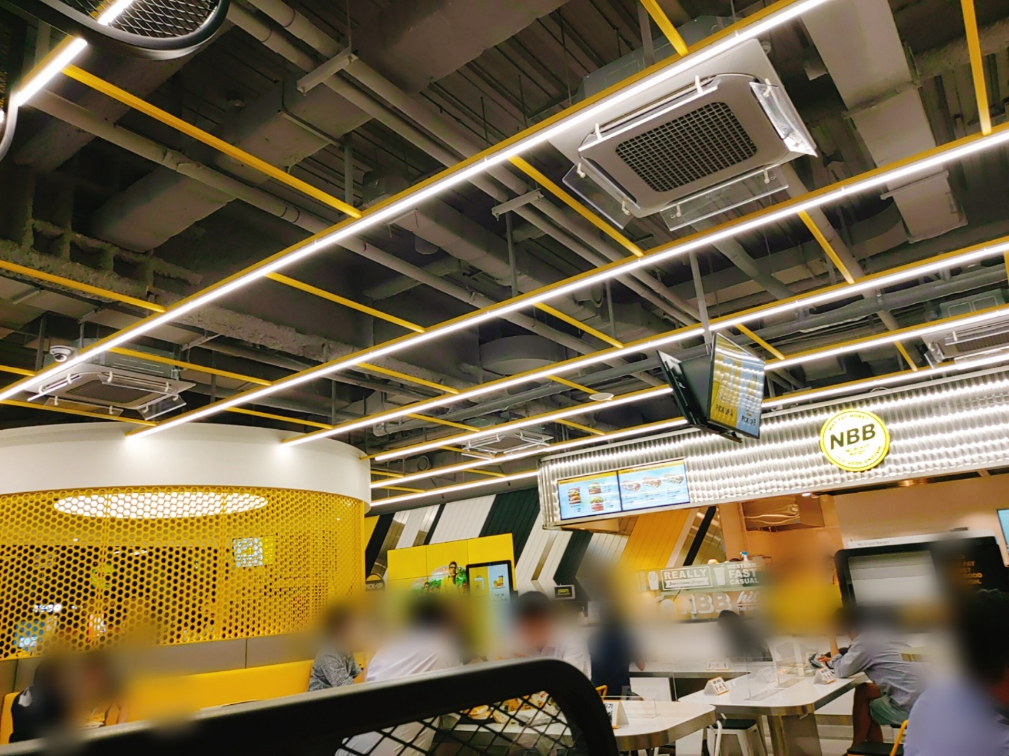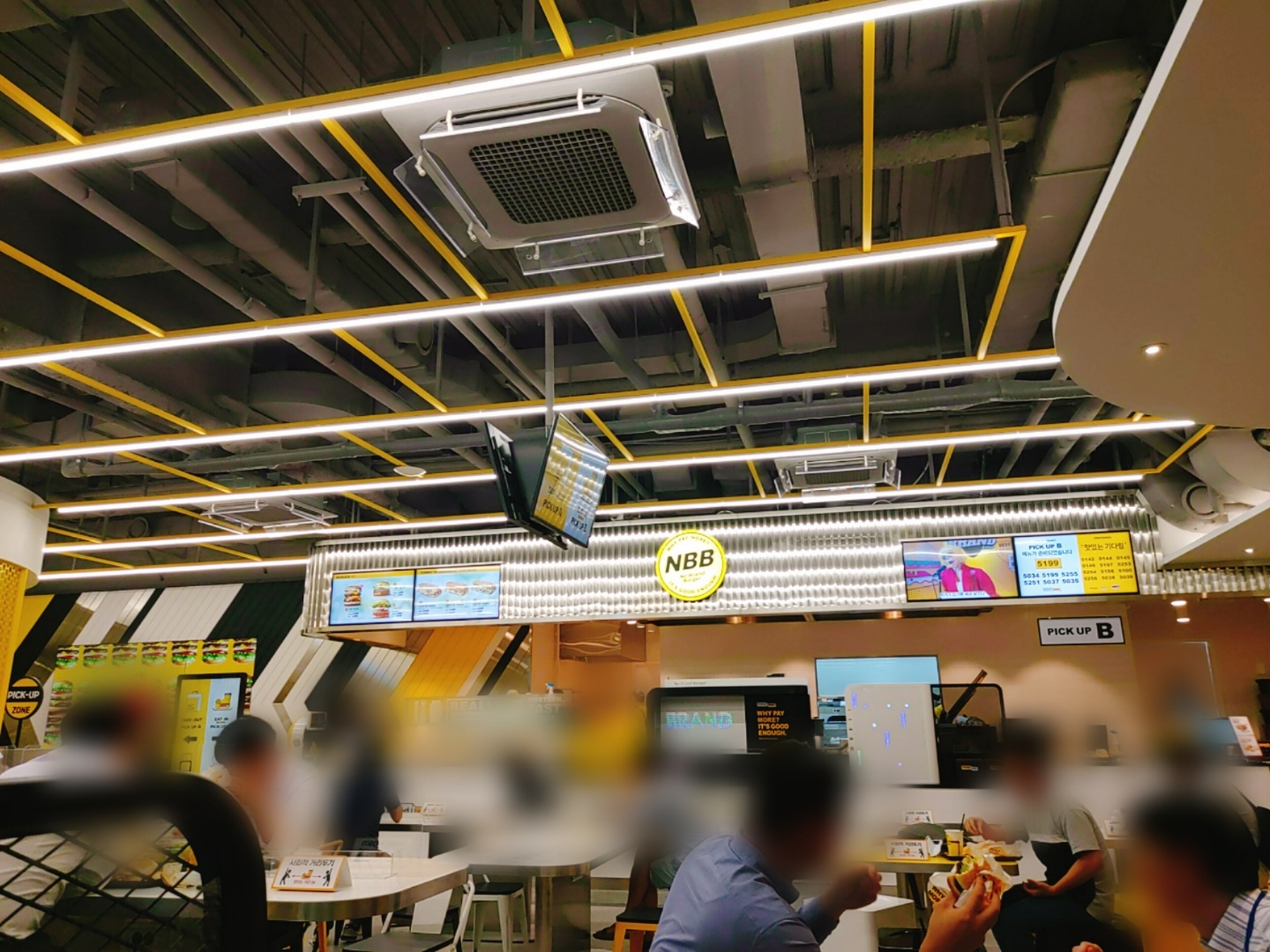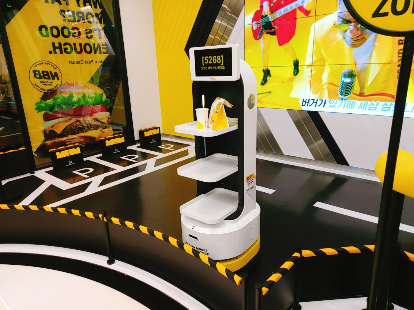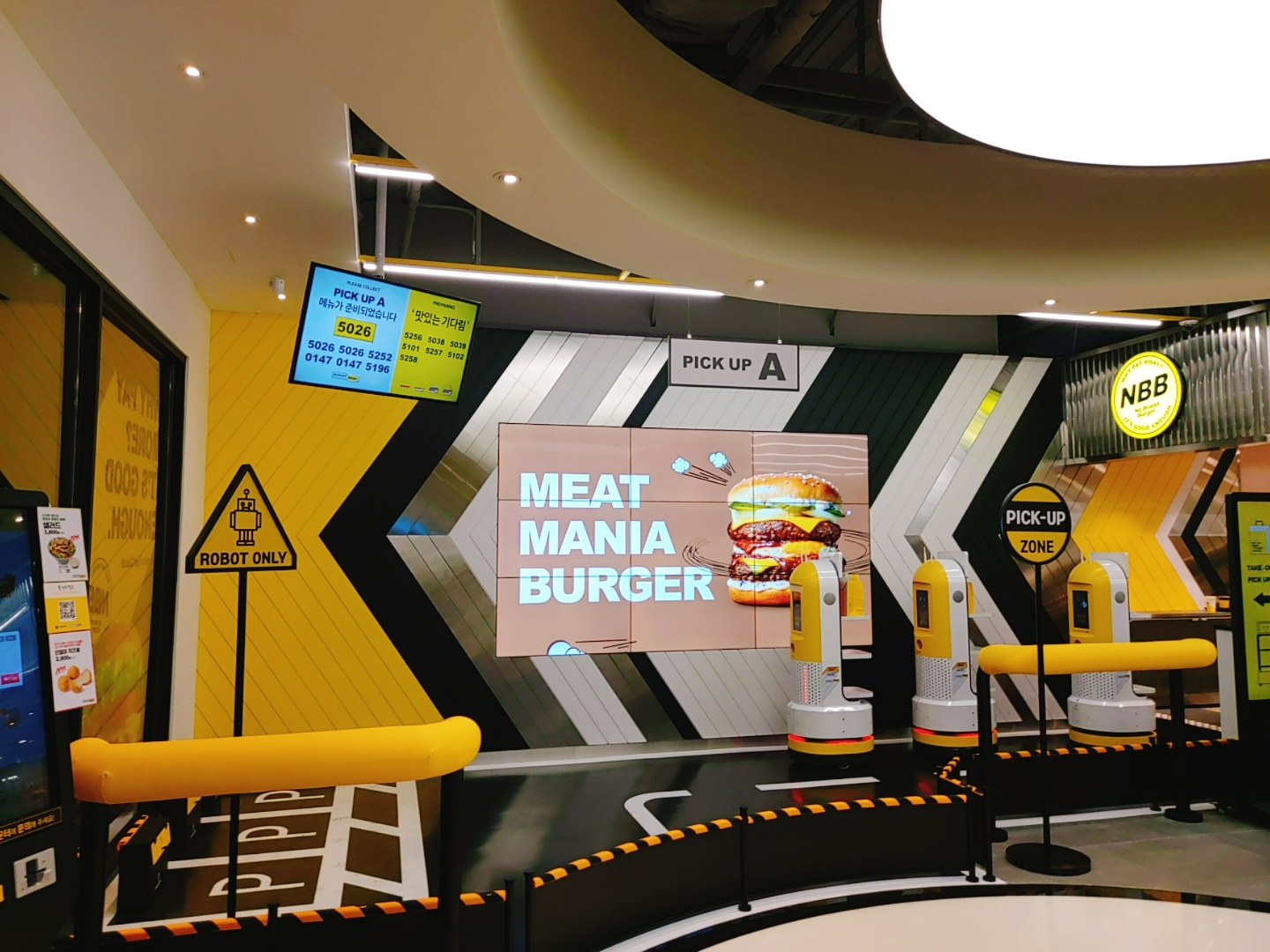 특이하게도 노브랜드 버거는 테이크 아웃을 할 때는 키오스크 쪽으로 기계가 와서 주문한 포장된 음식을 가져다 줍니다.